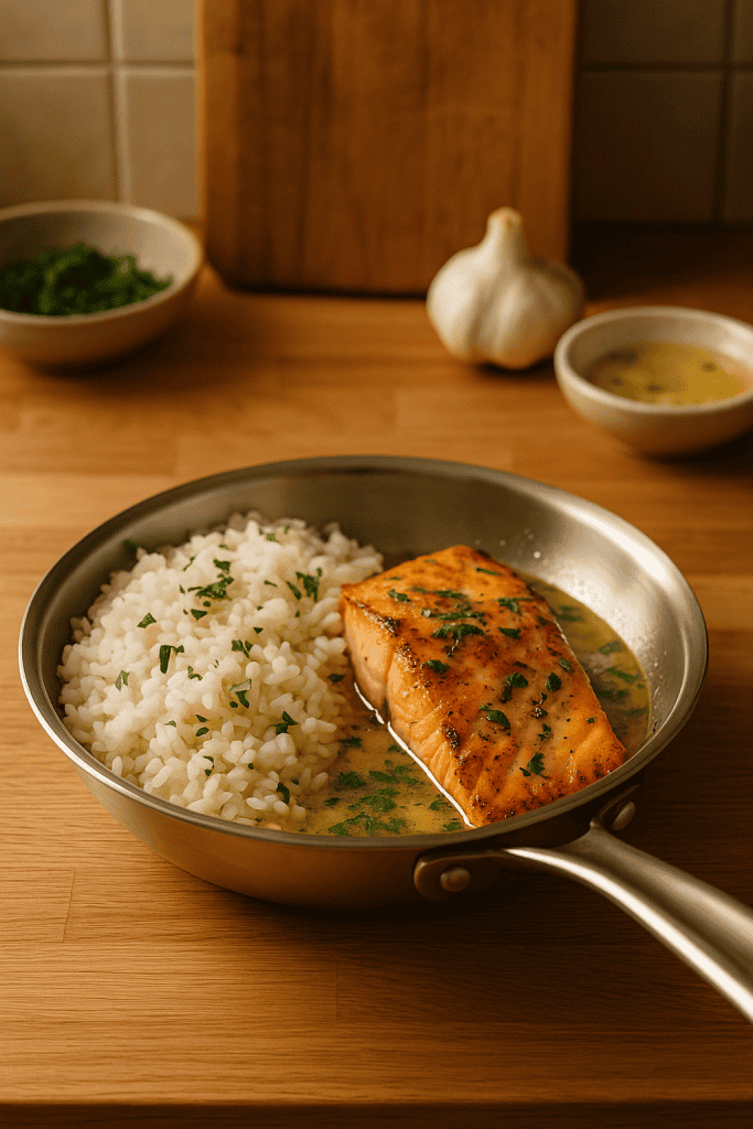 Tender salmon pieces in buttery garlic sauce, served with fluffy rice — light, warm, and satisfying.